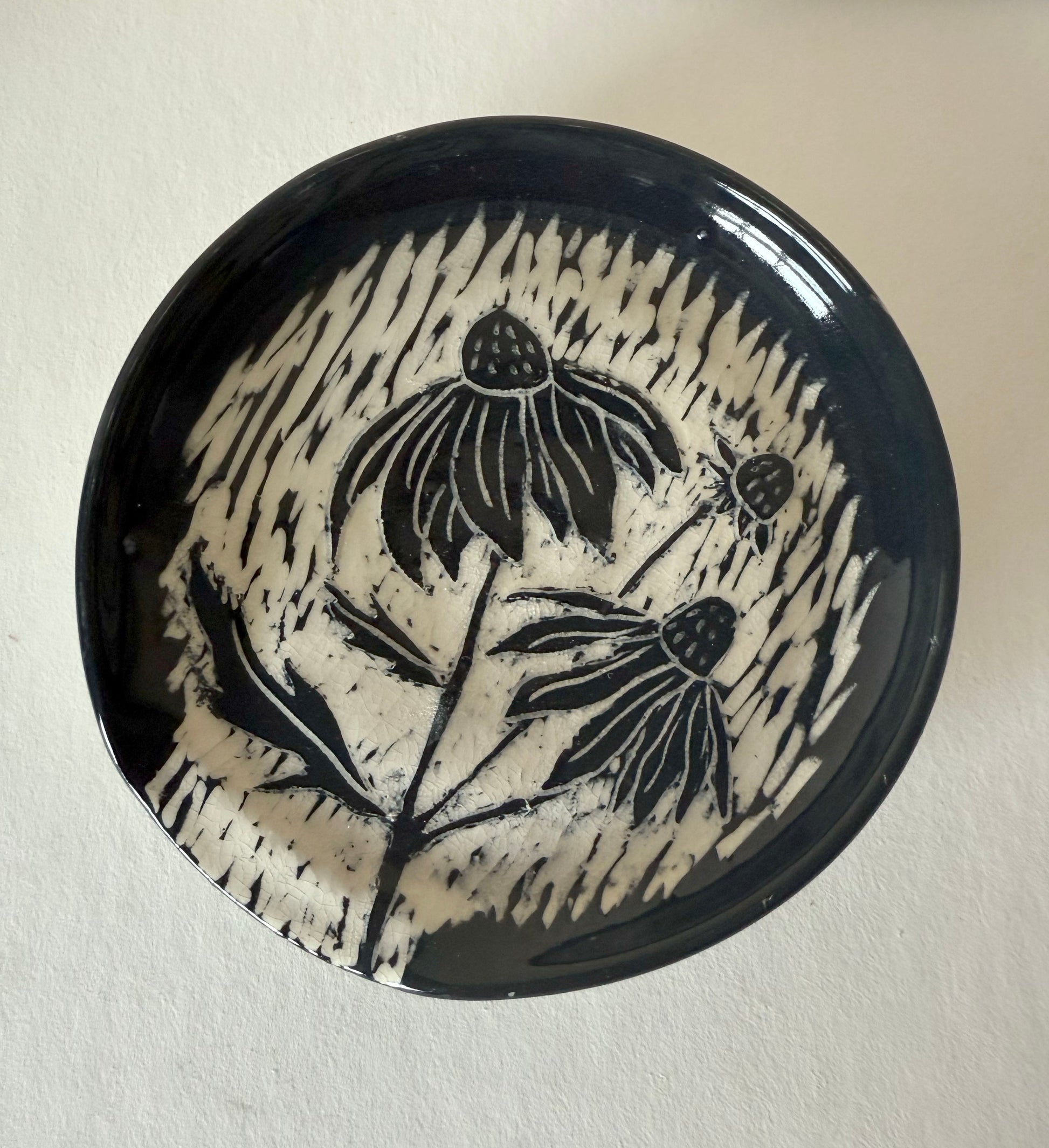 Add a touch of artistic flair to your kitchen with this pretty, one-of-a-kind spoon rest featuring a bluish black sgraffito design of black-eyed susan flowers. Keep your countertops clean and your cooking utensils within easy reach, all while brightening up your space with the beauty of nature. A must-have for any home cook!